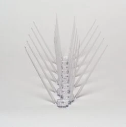 De kunststof duivenpinnen zijn op een 335mm lange strip van polycarbonaat kunststof aangebracht. De afstand tussen de pinnen bedraagt 32mm. Op de transparante en UV bestendige kunststof basisstrip bevinden zich in totaal 20 pinnen. De 110mm lange pinnen hebben aan de bodem een doorsnede van 3 mm en aan de top een doorsnede van 1mm.