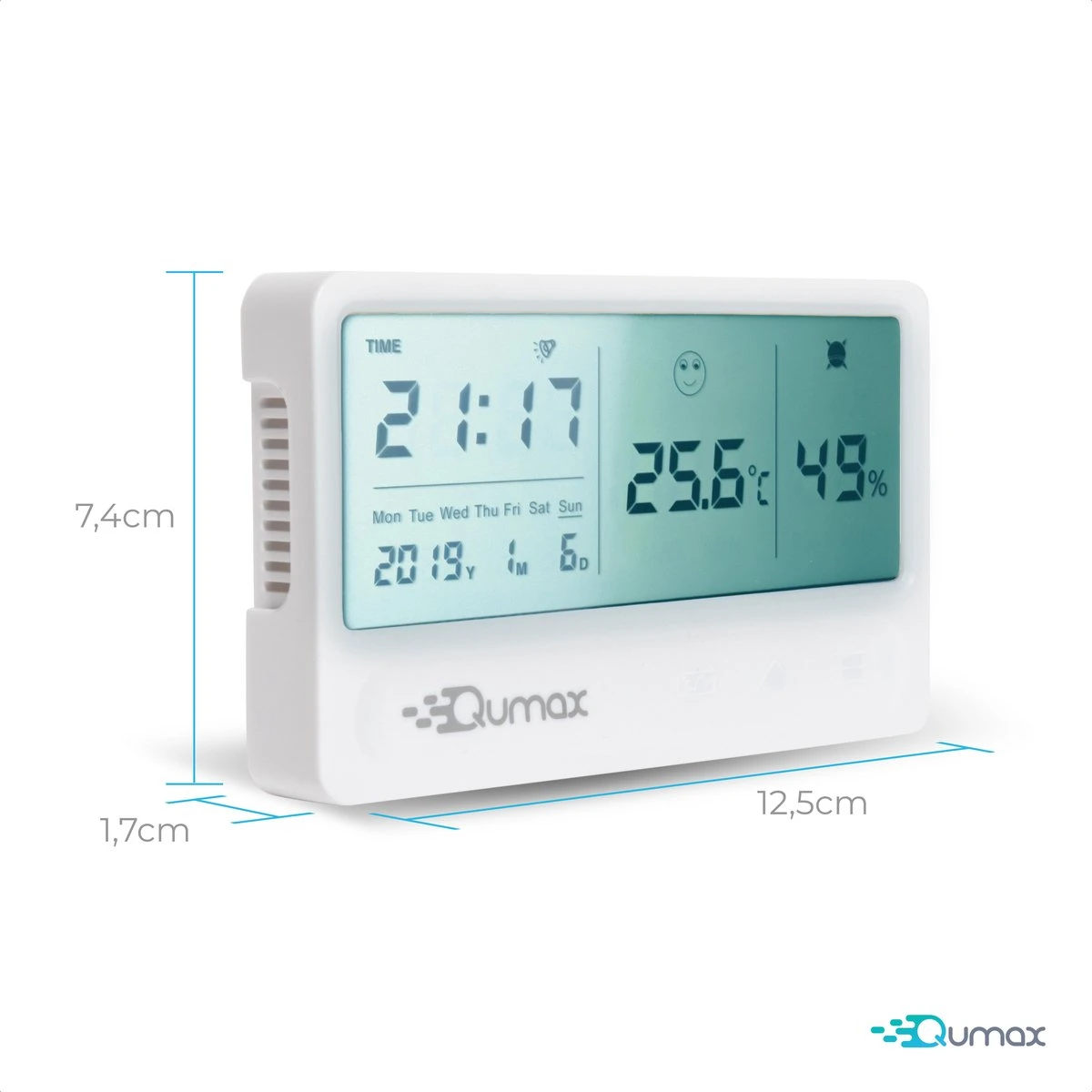 Naast de weergave van kamertemperatuur en luchtvochtigheid bevat de Qumax Hygrometer ook een comfort zone indicator. Hiermee wordt er door middel van een emoticon aangegeven of de temperatuur en luchtvochtigheid comfortabel en aangenaam is. In één oogopslag kan worden gezien of de kamer te warm, koud, droog of vochtig is.