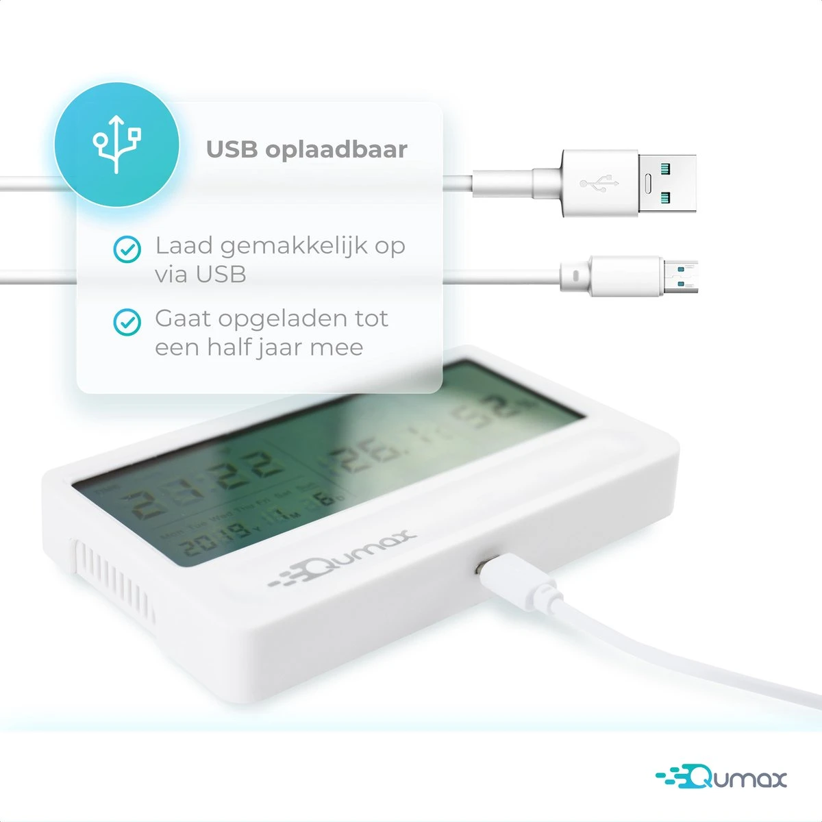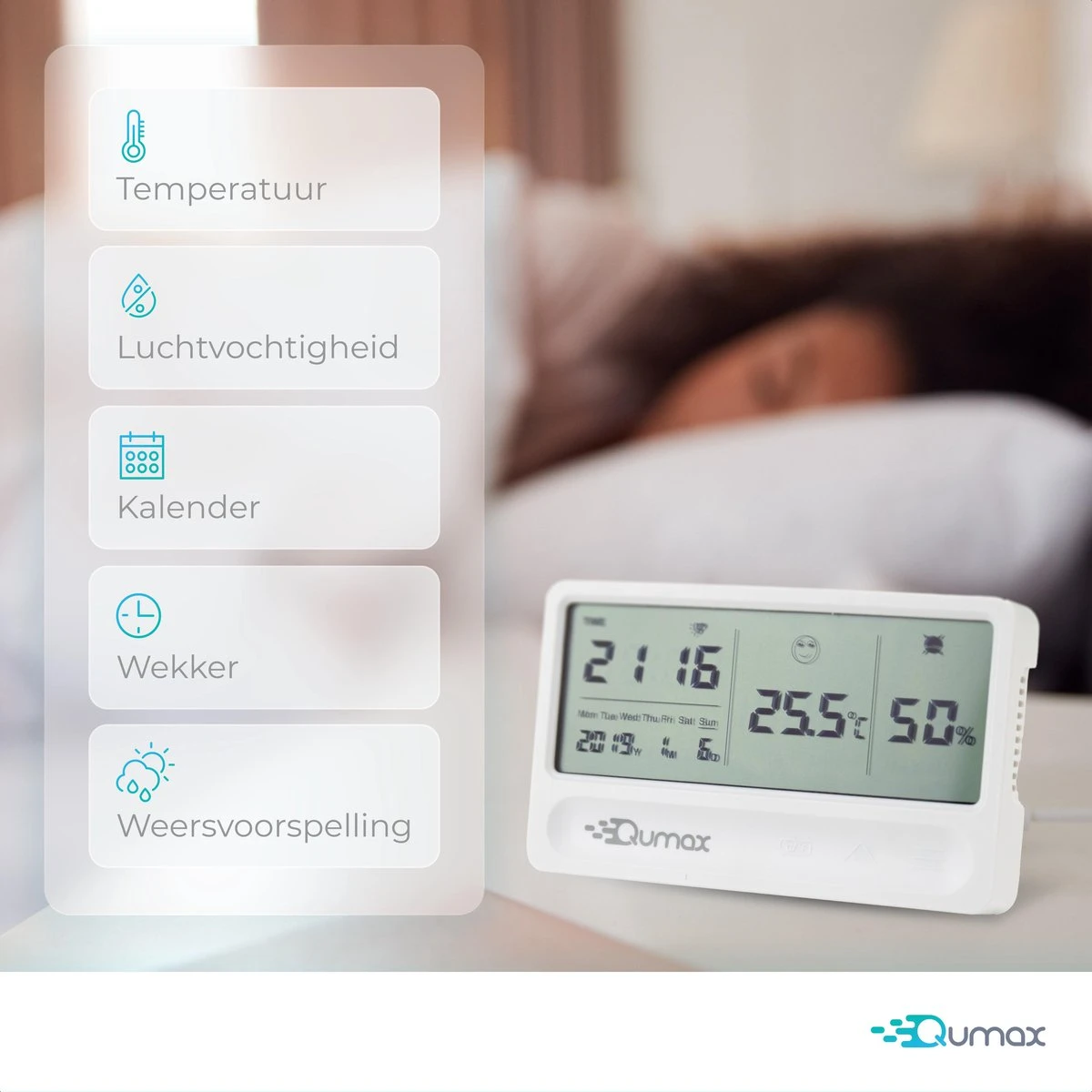 Nauwkeurig de temperatuur en luchtvochtigheid meten? De Qumax Digitale Hygrometer is hét perfecte apparaat om gemakkelijk de luchtvochtigheid in huis te meten. De multifunctionele thermometer kan hiernaast ook worden gebruikt als klok, wekker en kalender. Het apparaat is voorzien van een sterke accu waardoor de Hygrometer een batterijduur van zes maanden heeft.