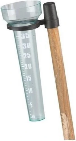Een regenmeter voor nauwkeurige bepaling van regenval. Word geleverd incl. houder welke u aan de bovenkant van een stok kunt plaatsen. Afmeting: ca. 24 x 8 cm. Materiaal: plastic.