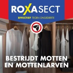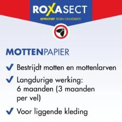 Ben jij helemaal klaar met al die motten in je kledingkasten en die gaatjes in jouw mooie kleding en dekens? Roxasect mottenpapier houdt jouw kledingkast zes maanden mottenvrij. Het papier bestrijdt motten en mottenlarven effectief. De voordelen van Roxasect Mottenpapier: – Bestrijdt motten effectief – Voor liggende kleding – Werking: 6 maanden