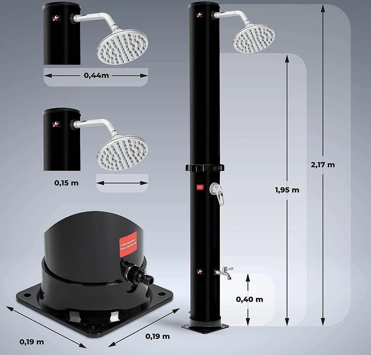 De douche is extra hoog en heeft een totale hoogte van 215 cm. De voetdouche is 41 cm hoog en de douchekop is verstelbaar en 180 graden draaibaar. Wanneer de douche niet gebruikt wordt, plaats je de beschermkap over de douche zodat invloeden van buitenaf, zoals regen of wind, de douche niet beschadigen.