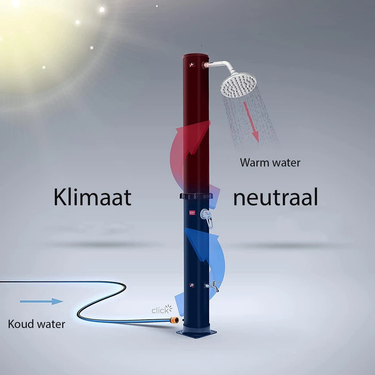 Met behulp van zonne-energie wordt het water in de container verwarmd en is het beschikbaar wanneer u na het zonnen of tuinieren een verfrissing nodig hebt. De douche is uitermate geschikt voor het gebruik in de tuin, op de camping of bij het zwembad. Dankzij een super snelle montage en demontage van makkelijke schroefverbindingen. De 35 liter watertank van de douche is te vullen met een standaard tuinslang. Het warme water wordt door een mengkraan met koud water gemengd, door deze techniek kan de watertempratuur worden aangepast.
