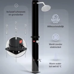 De Sens Design zwarte tuindouche is te gebruiken zonder stroom en heeft een inhoud van 35 liter waardoor jij altijd buiten jezelf kan afspoelen. De zonnedouche heeft een modern uiterlijk en is uitgerust op een stabiele voet. Zonder externe energie kunt u het water opwarmen tot 60 graden, zo ontlast u ook uw portomonee en is de douche milieu vriendelijk.