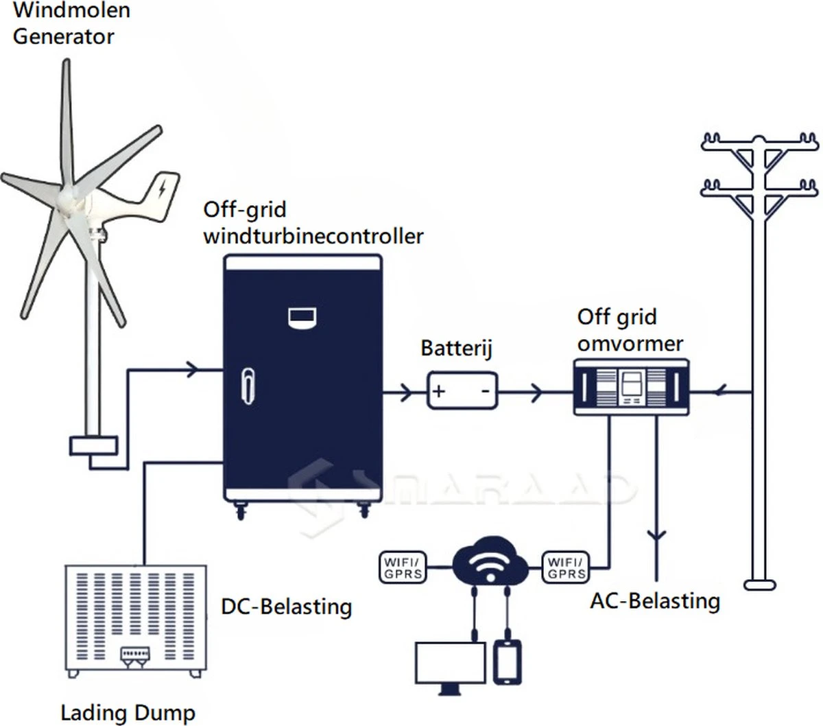 De windmolen generator van SMARAAD heeft een vermogen van 1000W genoeg om veel stroom op te wekken.