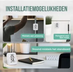 Zet hem neer op tafel, hang hem aan de muur met de uitsparing of plak de meter ergens op middels een plakstrip. Te plaatsen waar je maar wilt.
