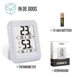 De digitale thermo– en hygrometer van Strex meet nauwkeurig de luchtvochtigheid en kamertemperatuur in huis. Dit kleine maar slimme apparaat geeft in één oogopslag weer of de ruimte te droog, te vochtig, te warm of te koud is. Plaats de thermometer-/hygrometer op een centrale plek in huis en hij doet meteen zijn werk. Kortom de thermometer van Strex zorgt voor een optimale leefomgeving.