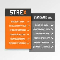 Last van muizen in je huis of tuin maar vind je de traditionele muizenval te wreed of onveilig? Dan is Strex diervriendelijke muizenval wat jij zoekt! De muizenval is voorzien van een valdeur die dicht zal gaan als de muis het aas bereikt, waardoor jij de muis kan levend kan vangen en hij geen pijn zal lijden. Het vrijlaten van de muis gebeurt eenvoudig en hygiënisch, je hoeft de muis namelijk niet aan te raken.