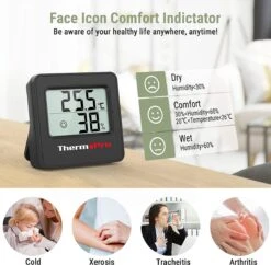 Met de thuisthermometer kunt u eenvoudig de luchtvochtigheid van de omgevingstemperatuur in realtime controleren en de nodige aanpassingen maken. Een goede beheersing van de luchtvochtigheid binnenshuis is gunstig voor de huid, allergenen en andere gezondheidsproblemen. Met een zeer nauwkeurige aflezing en een breed meetbereik is de bureauthermometer de perfecte thermometer voor luchtvochtigheid bij kamertemperatuur om u de beste leefomstandigheden te bieden. Ook te gebruiken als kamerthermometer voor babykamer, sigarenkistje, koelkast, kasthermometer en meer