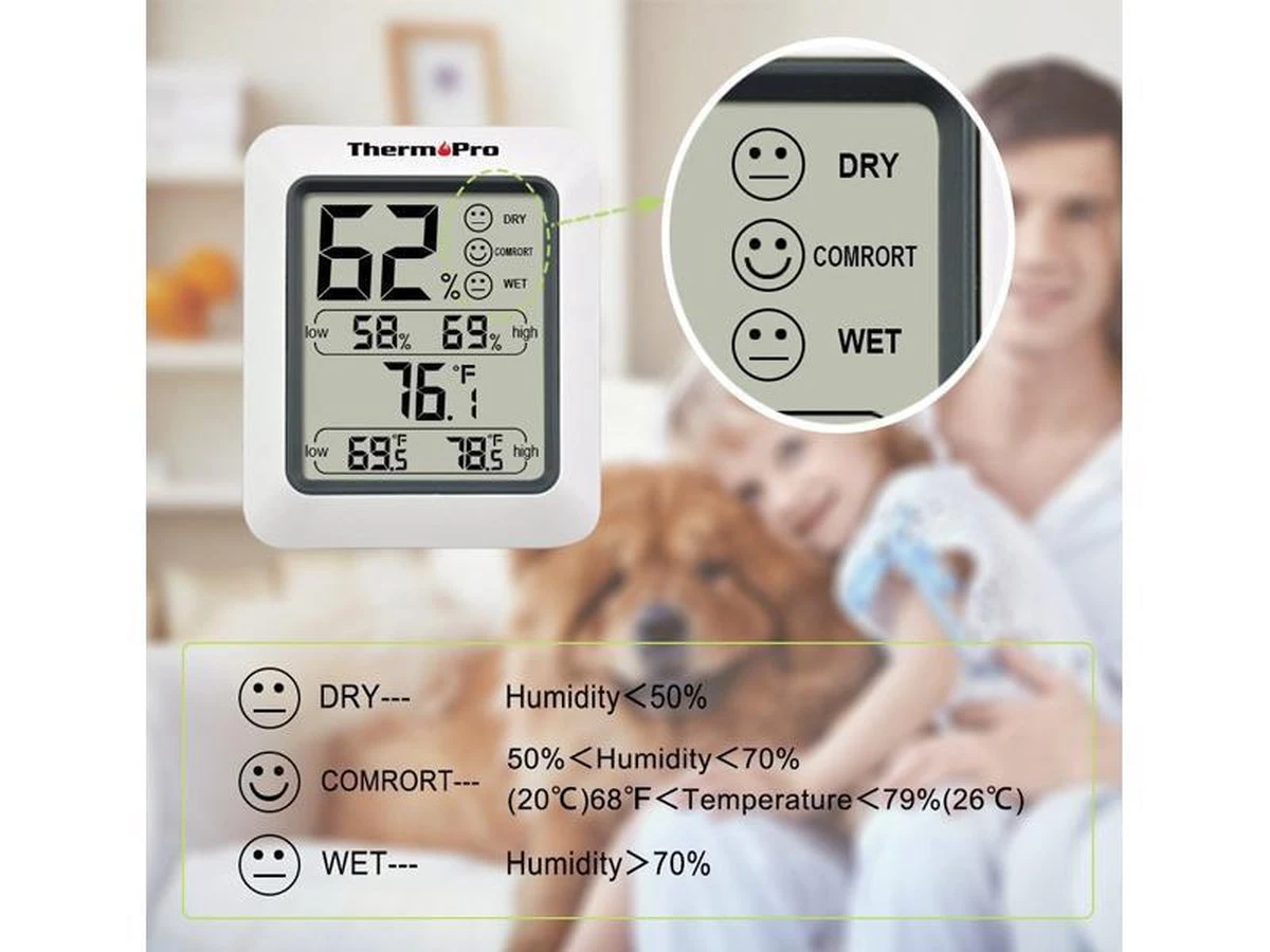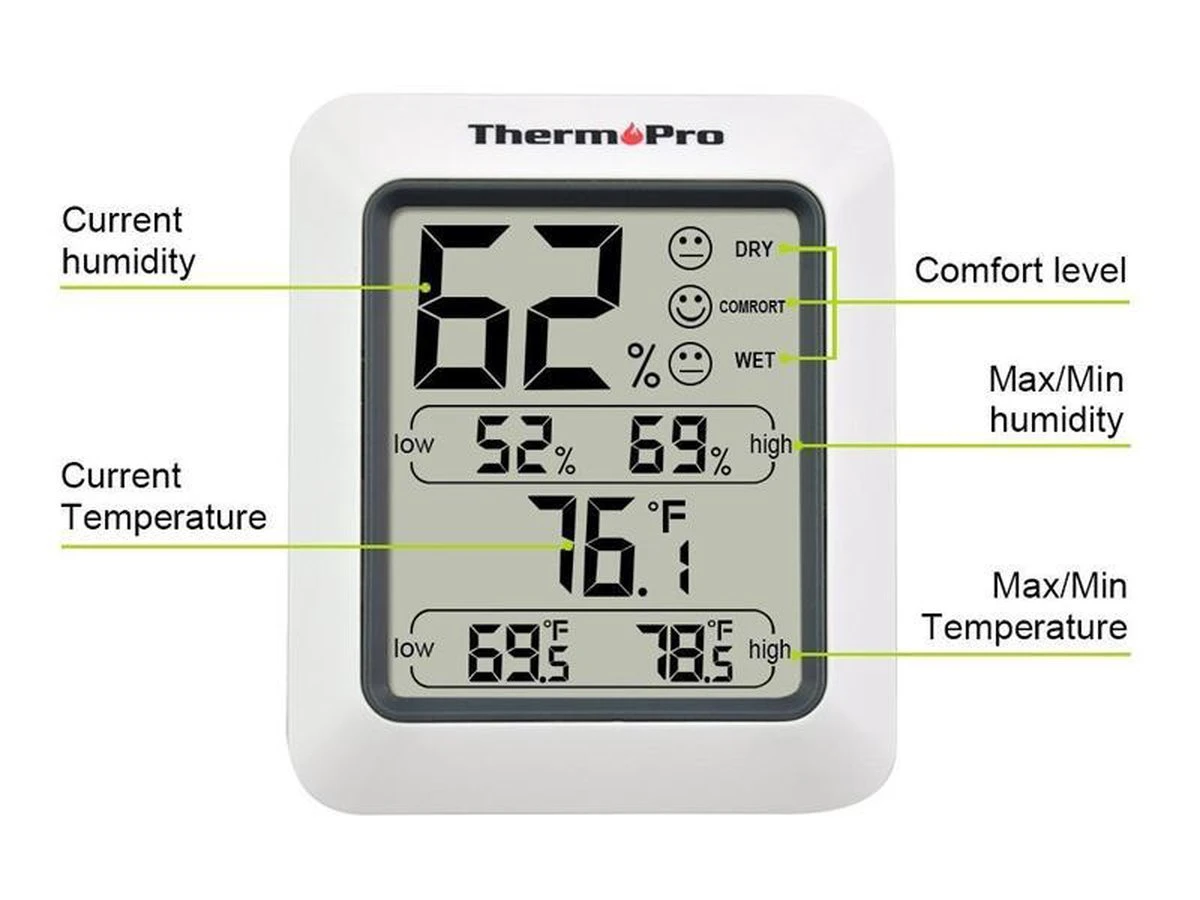 De Thermo Pro thermo- en hygrometer TP 50 meet nauwkeurig de luchtvochtigheid en kamertemperatuur in huis. Dit kleine maar slimme apparaat geeft in een oogopslag weer of de ruimtes te droog, te vochtig, te warm of te koud zijn. Kortom zorgt voor een optimale leefomgeving.