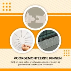 Het pakket bestaat uit 10 spike-strips, tiewraps en nano tape. Elke strip kan afzonderlijk worden gebruikt. Je kunt het zelfs in kleinere delen snijden om het in de kleinste ruimte te kunnen gebruiken. De zachte voet kan 360 graden worden gebogen, zodat de vogelbescherming goed past op gebogen of oneffen ondergronden zoals daken, open haarden, lamellen, goten, schuttingen, brievenbussen, balken, balkons, schuren en terrassen.