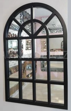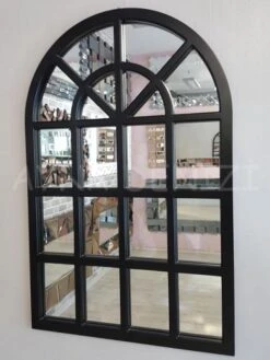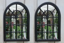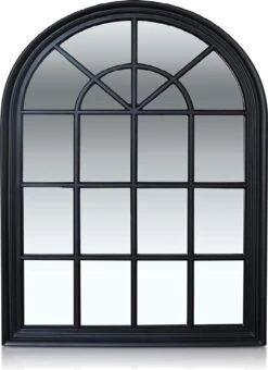Fraaie wandspiegel met gotisch kerkraam design frame, geschikt als tuinspiegel in de serre of onder een klein afdak maar ook erg mooi om binnen te gebruiken. Door het effectieve afwateringssysteem kan deze spiegel ook buiten hangen. De lichtelijke kromming van de achterkant zorgt er namelijk voor dat er niet snel water of condens achter blijft hangen!