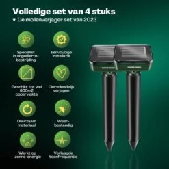 De mollenverjager van Vulpes Goods® zorgt er dankzij ultrasonisch geluid voor, dat de mollen er niet aan denken om in je tuin te komen of als ze er al zijn zo snel mogelijk te verdwijnen! Dit geluid is voor mensen nauwelijks te horen, maar voor mollen is dit geen fijn geluid net zoals de bijkomende vibraties, waardoor ze weg zullen blijven uit jouw tuin!