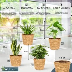 Deze mix van kamerplanten wordt geleverd in een trendy mand die passen in vrijwel alle soorten interieur. De hoogte van de planten varieert tussen de 25 en 35cm.