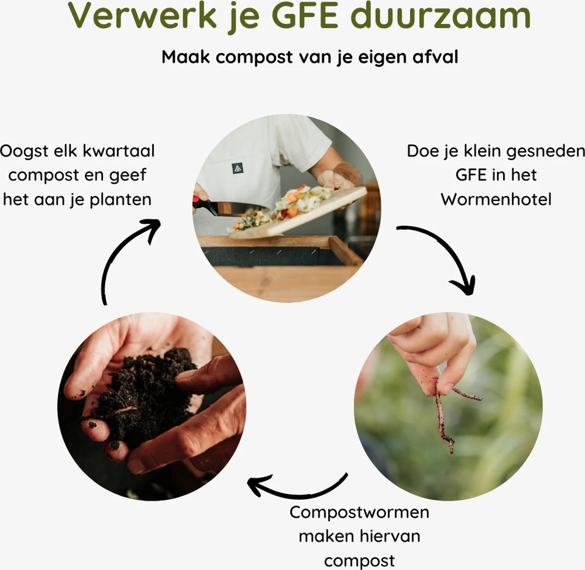 Het is erg makkelijk om je GFE te verwerken in een Wormenhotel. De compostwormen doen namelijk al het werk. Wat moet jij nog doen?