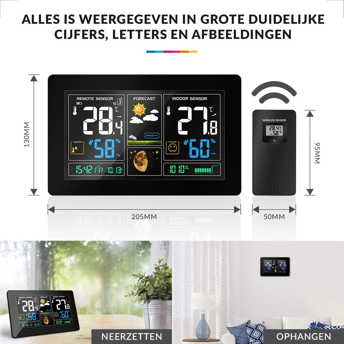 ▶︎ Afmetingen weerstation: 20.5cm x 13cm x 3cm