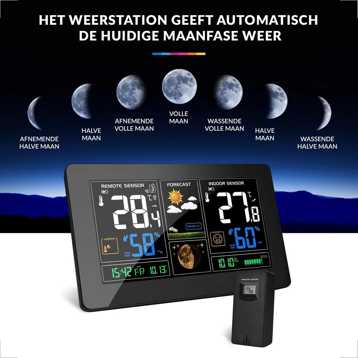 Het weerstation met buitensensor houdt u op de hoogte als de temperatuur boven of onder uw vooraf ingestelde waarde komt. En door gebruik te maken van de maanstanden is YONO’ s weersvoorspelling bovendien nauwkeuriger dan die van andere merken.