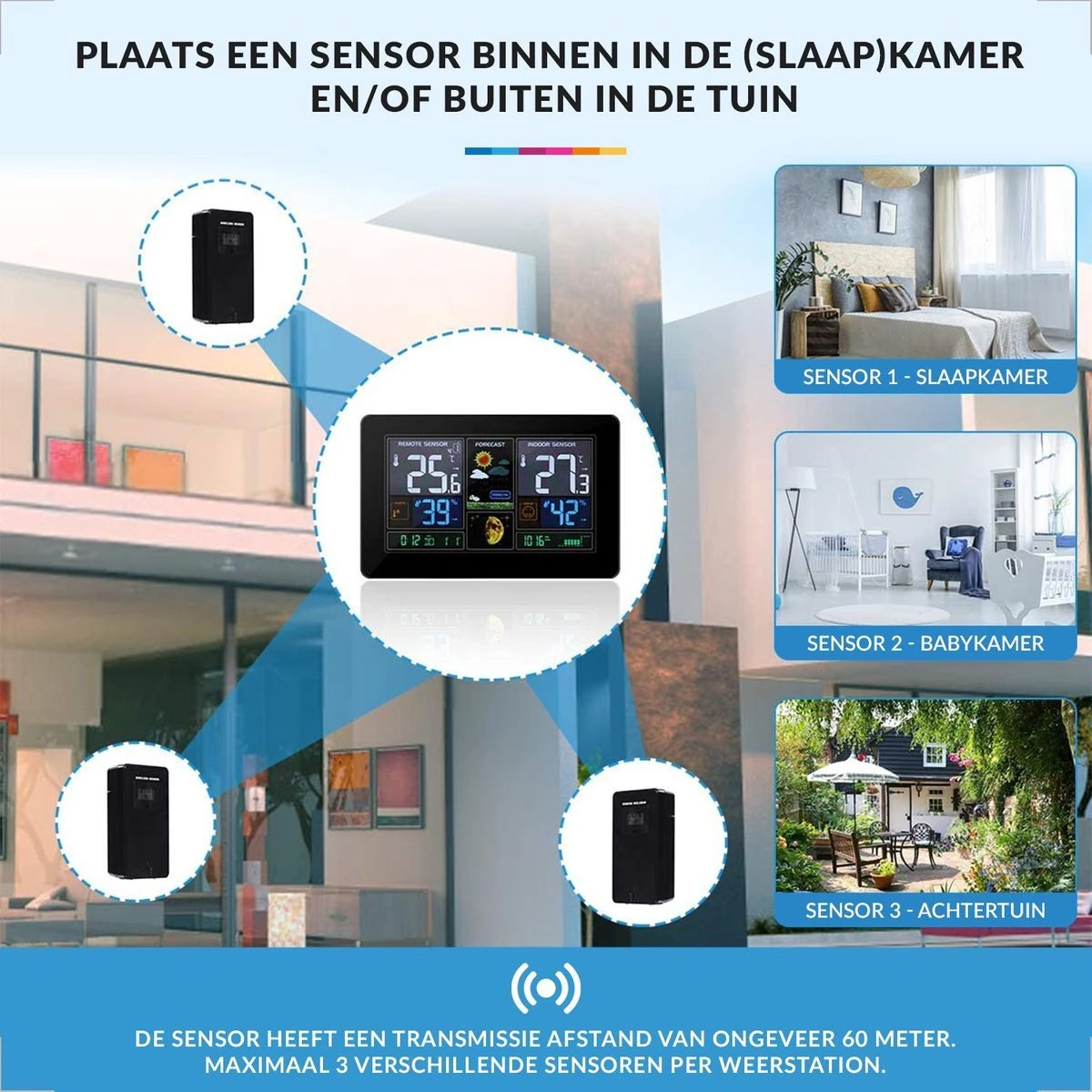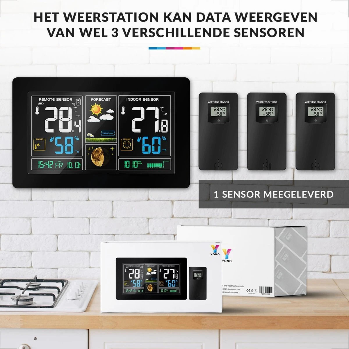 Het weerstation wordt geleverd met een buitensensor met een bereik tot wel 60 meter. Als u meerdere (buiten) sensoren wilt koppelen aan het weerstation is dit mogelijk tot maximaal 3 stuks, het is ook mogelijk om een sensor binnen te plaatsen bijvoorbeeld op de kinderkamer. Als u de sensoren wilt aanschaffen kunt u zoeken op “Buitensensor voor YONO Weerstation WS300”.