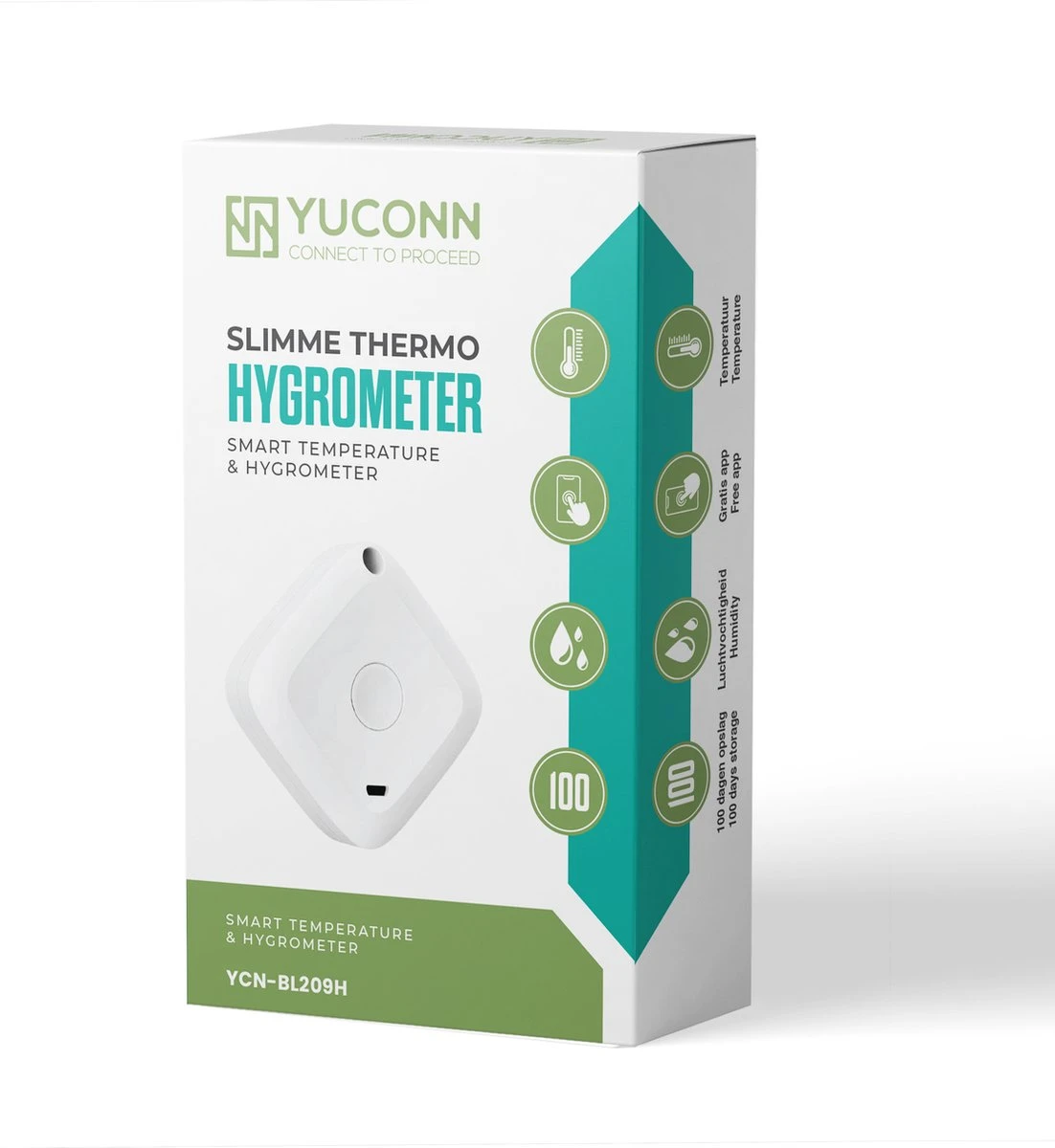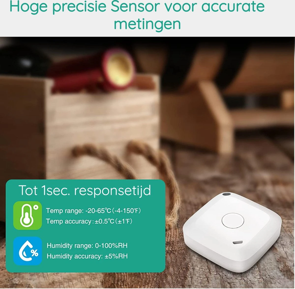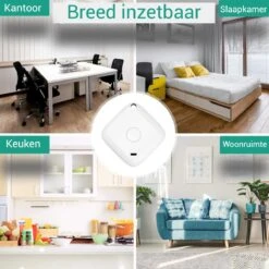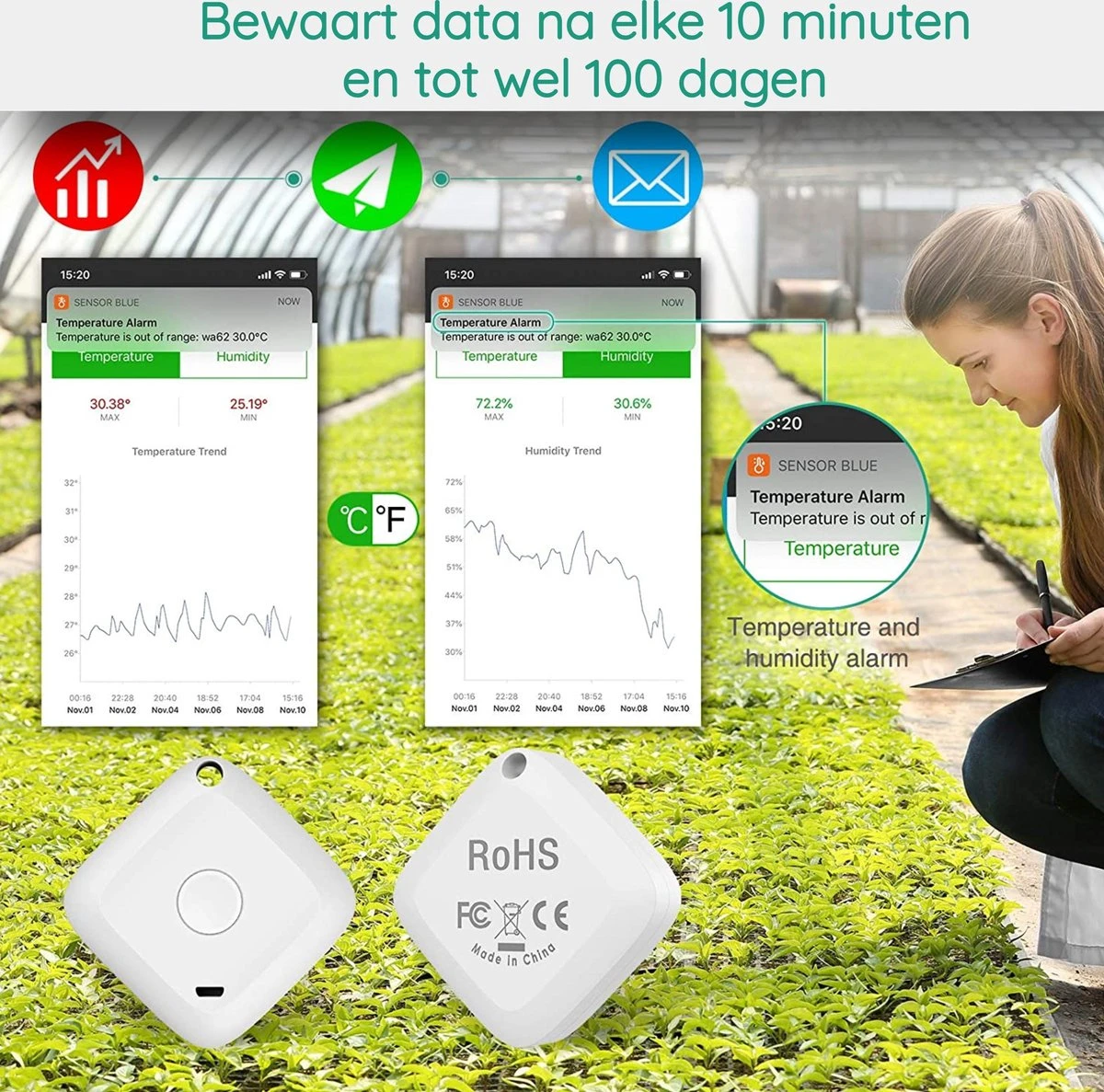 – App pusht meldingen zodra temperatuur of vochtigheid buiten het vooraf ingestelde bereik valt.