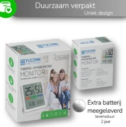 De hygrometer van Yuconn meet naast de luchtvochtigheid ook de temperatuur en met de 3 kleurenindicaties kun je in 1 oogopslag zien of de luchtvochtigheid te hoog / te laag of comfortabel is. Ook worden de tijd en datum weergegeven.